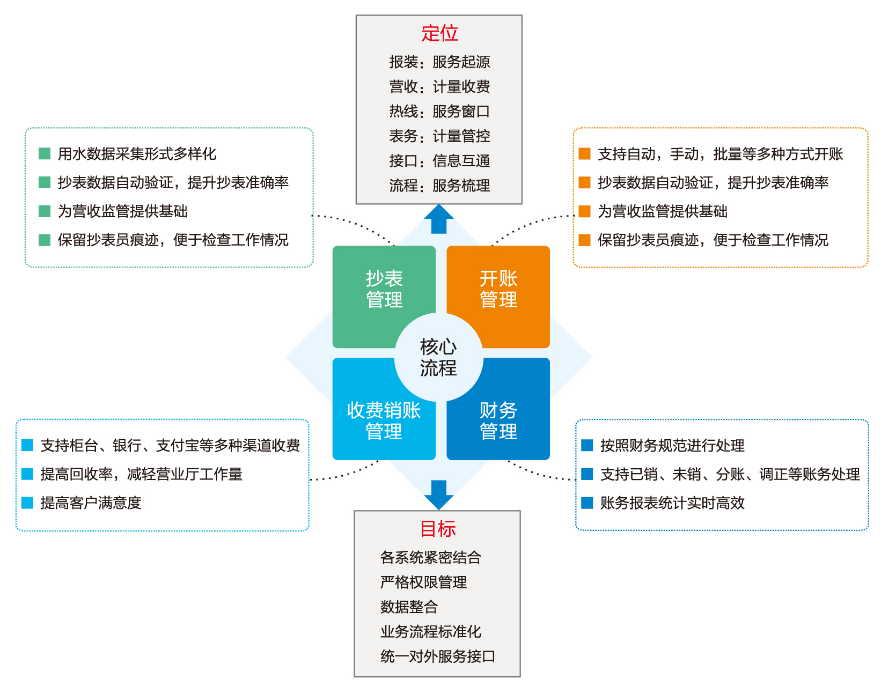 营业收费系统是一套集客户管理、表具管理(机械表、IC卡表、远传表、大口径表)、财务管理、抄表结算、报表分析、表务管理等功能为一体的综合性收费管理系统。系统对所有数据进行多角度、多层次的记录、比较、分析,对管理决策给予支持。