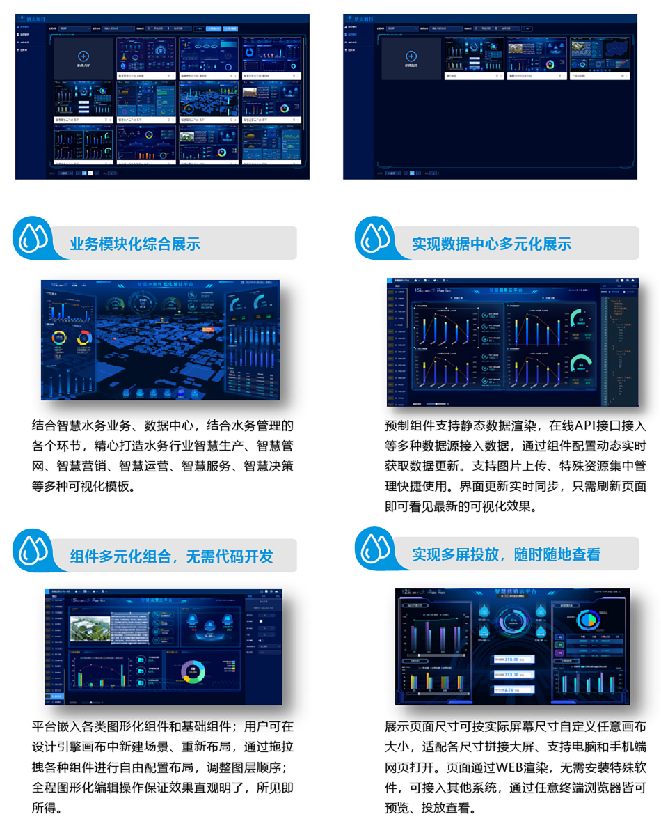 水务可视化平台帮助客户顺利获得可视化应用模块分析展示庞杂数据。将业务数据图形化、形象化,旨在让更多的人直观看到数据可视化的魅力,给企业人员给予简单、易操作的数据可视化界面搭建平台,满足业务监控、数据分析、安全预警、地理信息分析等各行业多业务的展观需求,实现水务企业运行管理的信息化、智能化、可视化和集成化。