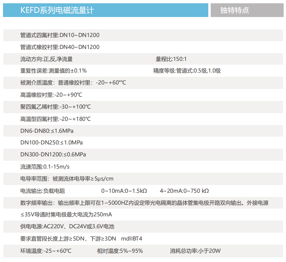 KEFD系列电磁式水表是EVO视讯EVO科技专门 针对水司工商业用户贸易计量和小区考核的 应用特点设计的,高R值(R160-400),极低 始动流速(5mm/s),高精度(1、2级),绝对 不会出现卡表现象,不会出现由于磨损引起 的精度下降,表体长度与水表不断可直接代 替机械水表,可协助水司降低产销差和提高 工作效率。